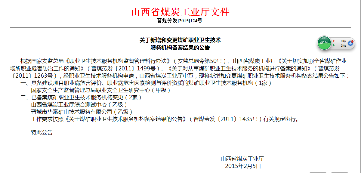 晉城國投華泰科技有限公司(以下簡稱華泰公司)是一家經(jīng)營性國有企業(yè),注冊資金1000.2萬元(由晉城市華泰礦山技術(shù)服務(wù)有限公司和晉城澤泰安全技術(shù)服務(wù)有限公司合并整合組建,國投全資)。公司持有山西省衛(wèi)生健康委員會頒發(fā)的《職業(yè)衛(wèi)生技術(shù)服務(wù)資質(zhì)證書》、山西省應(yīng)急管理局頒發(fā)的《安全評價(jià)機(jī)構(gòu)資質(zhì)證書》和山西省市場監(jiān)督管理局頒發(fā)的《檢驗(yàn)檢測機(jī)構(gòu)資質(zhì)認(rèn)定證書》等資質(zhì),設(shè)施設(shè)備、能力、資質(zhì)配套齊全。...【詳細(xì)信息】